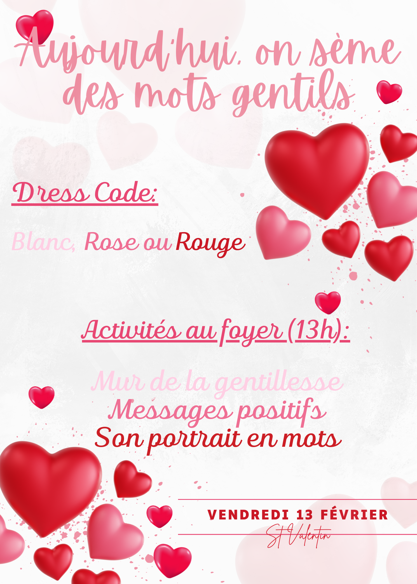 Ils vous offrent une journée toute douce, pleine de couleurs, de mots gentils et de petites attentions qui font du bien. Pas la fête des amoureux, non. Juste une parenthèse de gentillesse au cœur du collège, pour sourire ensemble et se rappeler qu’on peut rendre la journée de quelqu’un plus belle avec presque rien.